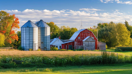 American Countryside Farm Landscape with Red Barn and Blue Sky.
