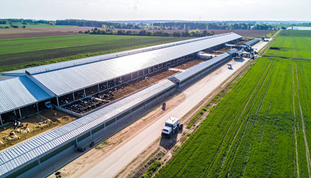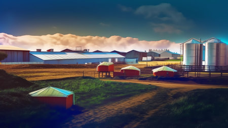 Green fields surrounding an industrial livestock farm, with large barns and silos in the distance, illustrating the integration of farming and agriculture