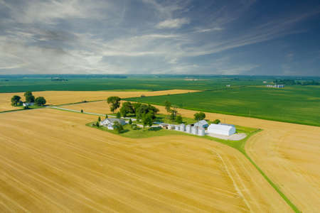 An aerial perspective showcases a patchwork of green, yellow, and brown agricultural fields divided by roads, with farm buildings and silos visible.
