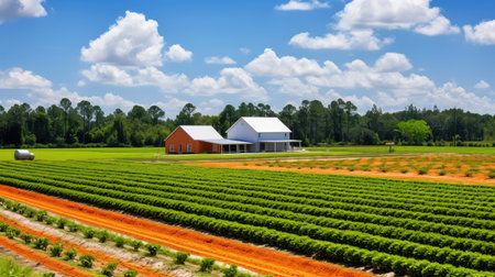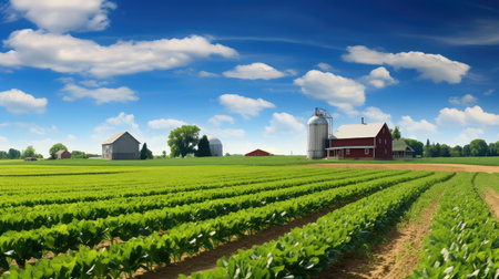 An extensive farm with silos, barns, and rows of vegetables and grains Generative AI