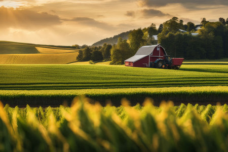 A serene view of a tranquil farm with a tractor on a dirt road, a red barn, and abundant green crops set against a majestic mountain backdrop in the early morning light.