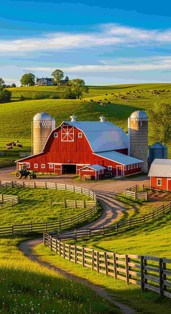 A picturesque farm scene features a red barn and silos surrounded by green fields and grazing cows under a bright blue sky with fluffy clouds.
