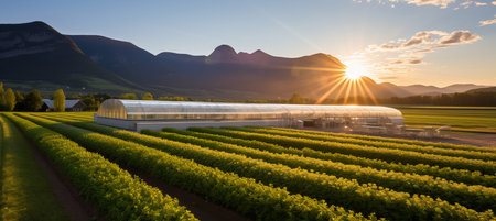 As the sun sets, its golden rays bathe a modern agricultural warehouse in warm light. Nestled amidst rolling green fields, this structure represents the intersection of contemporary farming technology and the timeless beauty of the rural landscape, a symbol of growth and productivity.