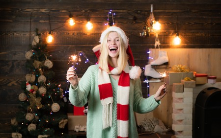 Elegant young woman celebrating Xmas with sparklers sitting on the floor in front of the fire with a Christmas tree behind her