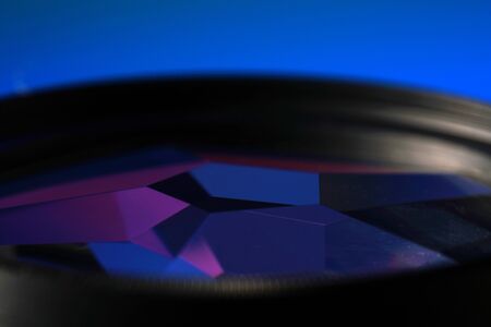 Macro shot of a camera lens with blue neon light and a cloud of fine dust creating an artistic atmosphere.