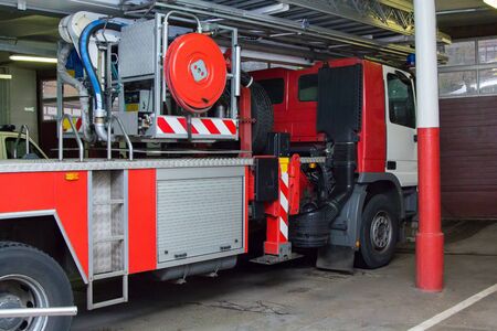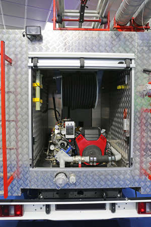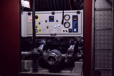 Fire truck equipment inside back of the car. Open back side of red firetruck with water supply connection