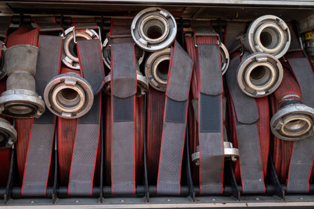 Detail with heavy duty water hoses on firefighter vehicle