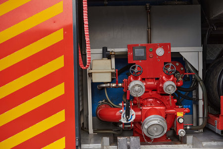 Close-up of essential firefighting equipment on a modern firetruck, showcasing tools and gear ready for emergency response to hazardous fire situations