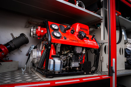 Bright red portable fire pump in fire truck bay with gauges and valves