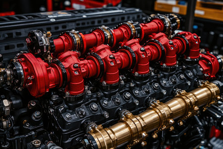 An intricate view of a sleek engine displaying expertly engineered parts, highlighted by striking crimson details that emphasize power and precision.