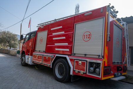 Seferihisar, Izmir, Turkey - 03.09.2021: side view of red traditional fire engine parked in front of local fire department