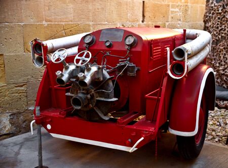 Back of a classic retro red fire truck with metal pipes