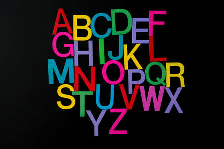 Colorful wooden english letters A-Z on black background and copy space for educational and graphic concept