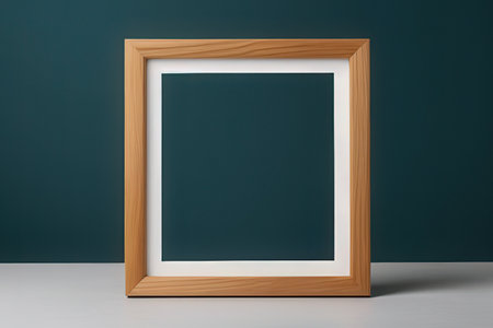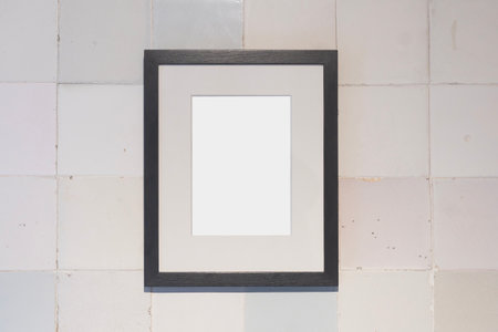 A black photo frame with a blank white center placed against a tiled wall background for modern design and decor