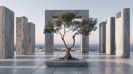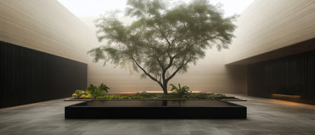 A single tree rises from the center of a minimalist courtyard, surrounded by smooth stone tiles and stark white walls, showcasing a balance of nature and modern architecture.