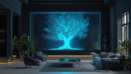 A modern living room features a glowing, light blue tree displayed on a wall. The lighting creates a vibrant, futuristic ambiance, ideal for a contemporary design. Soft furniture and dark accents complete the interior scene.