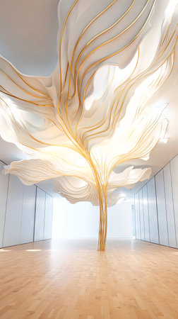 Large, ornate tree sculpture, crafted from white material and adorned with golden-colored leaves, is featured in a modern, bright interior space. The large tree is positioned in the center of the room with large windows around it. The interior space is characterized by its white walls, floors, and large windows.