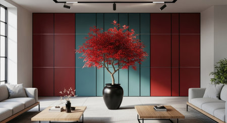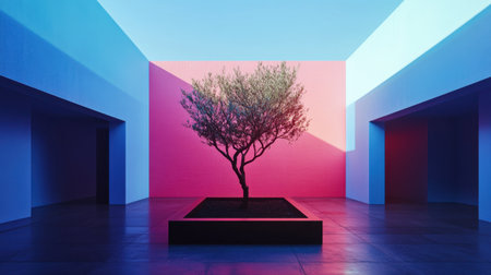 A striking minimalist indoor scene showcasing a solitary tree against vibrant geometric walls. This artwork creates a sense of tranquility and beauty.