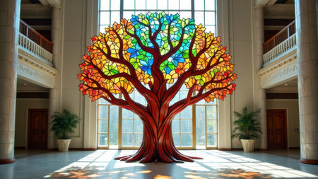Vibrant stained glass tree sculpture in sunlit modern atrium interior design. That the image is generated using AI.