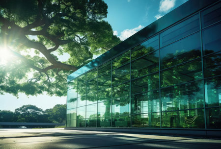 Modern office building with green tree and reflection in the glass wall.