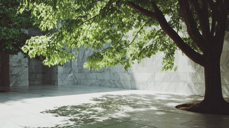 Tranquil courtyard scene featuring a large tree with lush green leaves casting shadows on a light gray paved area. The surrounding walls are made of large slabs of light gray stone. Natural light and shadows create a beautiful contrast in the image.