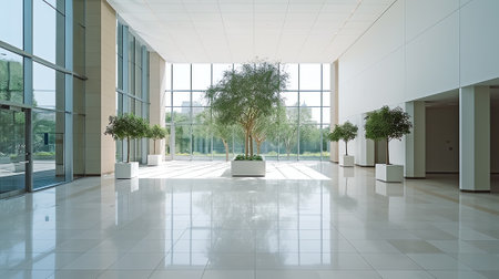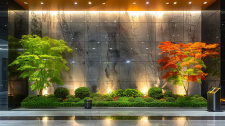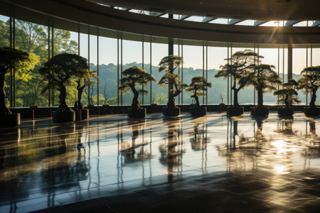 Giant bonsai tree inside business modern building ai generated background image. Company hall plant desktop wallpaper picture. Corporate indoor garden photo backdrop. Concept composition front view