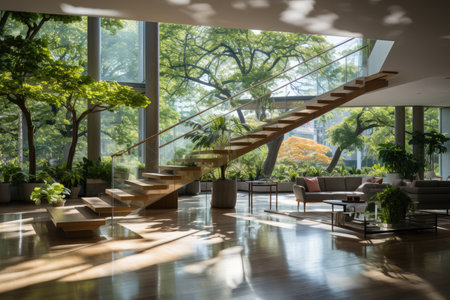 Contemporary apartment overlooking lush park, connecting nature and architecture., generative AI