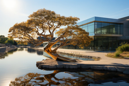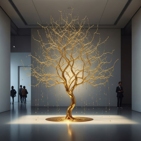 A striking golden tree sculpture is the focal point within a modern interior. The artwork features intricate branches and a polished, reflective base. The scene is illuminated by dramatic lighting, enhancing the metallic sheen. This piece could be utilized for editorial content related to art, design, or conceptual themes.