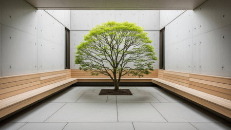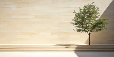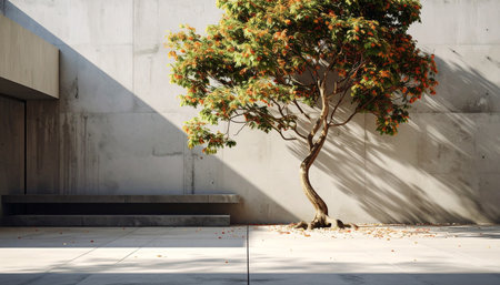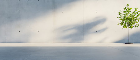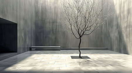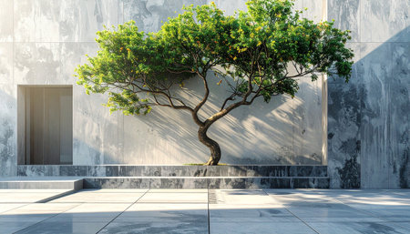 A tranquil indoor area showcases a solitary green tree positioned near a smooth concrete wall. The contrasting shadows enhance the minimalist aesthetic promoting a calming atmosphere.
