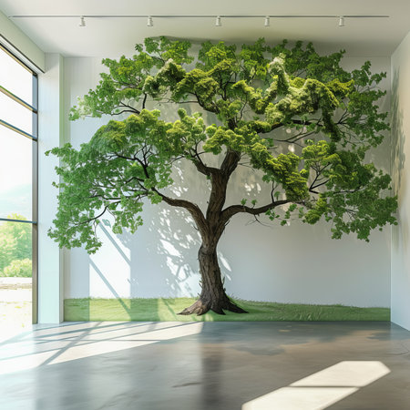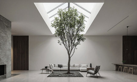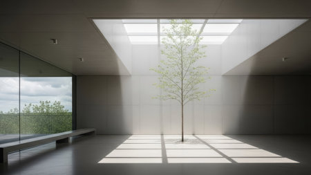 A vibrant green tree is the focal point within a modern, minimalist interior. The composition features clean lines, neutral colors, and natural light from a skylight. The space may provide a sense of serenity or a place for contemplation. Potential uses include editorial illustrations or stock imagery.