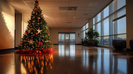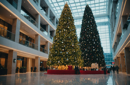 Modern skyscraper lobby with towering holographic Christmas tree.