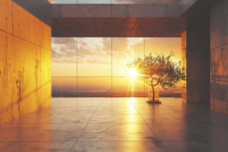 An open space with minimalist design, concrete walls, and glass partitions, illuminated by bright rays of the setting sun