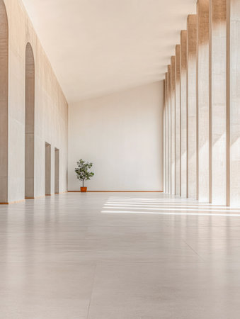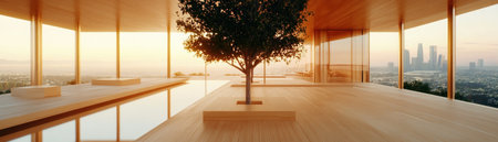 Natural light floods a spacious, minimalistic room featuring large windows and light wood flooring. A simple potted tree adds a touch of nature, emphasizing the serene design.