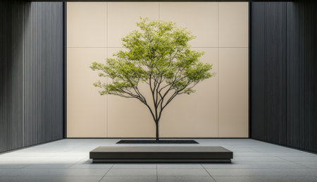 A single green tree stands prominently in a minimalist indoor setting surrounded by sleek walls and a light-colored backdrop. The design emphasizes simplicity and tranquility.