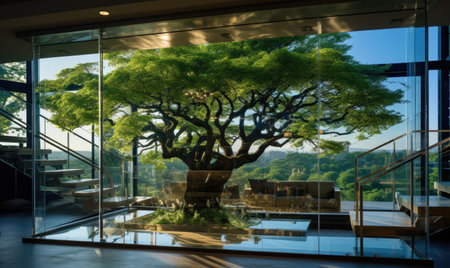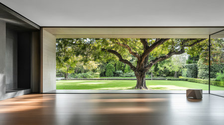 A contemporary interior space features expansive glass windows that frame a majestic tree and lush green landscape beyond. Natural light illuminates the wooden floor.