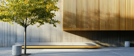 A sleek urban space features a minimalist concrete wall paired with a golden wood panel. A solitary tree adds greenery, while a long bench invites relaxation in daylight.