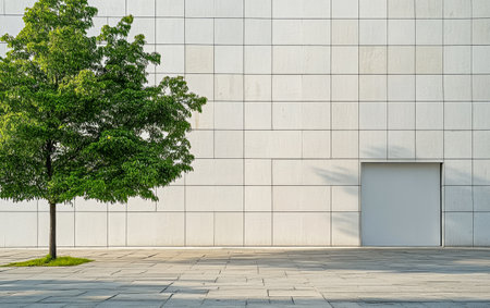 A solitary green tree is positioned next to a sleek, modern wall. The sunlight casts shadows, highlighting the contrasts between nature and architecture in a vibrant setting.