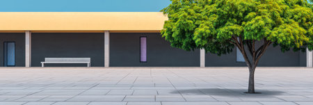 A vibrant tree stands beside a sleek, modern building in a minimalist setting. The clear blue sky provides a serene backdrop, enhancing the calm atmosphere of the space.