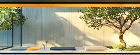 A contemporary room features simple cushions arranged on a smooth surface framed by a large window showcasing lush greenery outside. Gentle sunlight casts soft shadows enhancing tranquility.