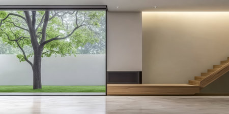 Spacious interior designed with elegance, featuring a large window that offers a clear view of a tree and grass outside, accentuating the natural light and serenity.