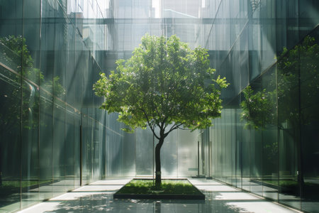 A tree is reflected in the glass of a building. The reflection of the tree is bright and clear, creating a sense of depth and dimension. The image conveys a feeling of harmony between nature