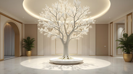 Dreamy white ornamental tree in elegant lobby for upscale hotel or luxurious office space design inspiration