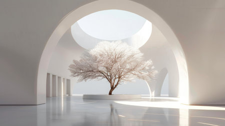 A peaceful indoor scene featuring a single blooming tree illuminated by soft natural light, creating a perfect balance of nature and modern design.