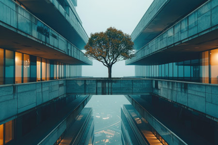 A solitary tree stands tall, its reflection dancing on the water below as the windows frame a breathtaking outdoor landscape within the confines of the room