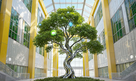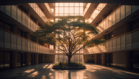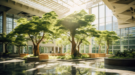 A modern indoor atrium featuring a tall green plant at its center, surrounded by natural light and contemporary architecture. The environment feels open, refreshing, and connected to nature.