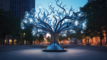In the heart of a bustling city at night, a luminous tree stands as a beacon of innovation.
