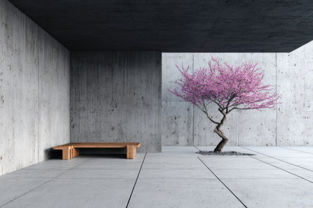 a hyper-realistic urban-style photo featuring a tree in a room with minimalistic composition. the tree is not clearly visible, adding an intriguing element to the image. the post-processing enhances the terracotta and concrete textures, creating a unique atmosphere. cherry blossoms add a touch of delicate beauty, while a bronze patina adds a subtle hint of elegance. ai generated