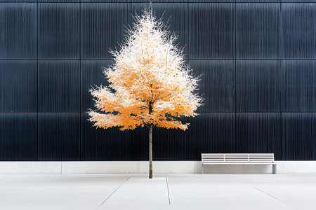 A striking lone tree with vibrant orange and white foliage stands against a minimalist black wall, creating an artistic visual contrast. A nearby bench adds to the serene atmosphere.