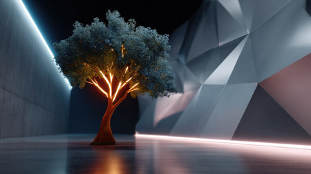 A captivating illuminated tree stands as a centerpiece in a modern abstract space, showcasing geometric walls and soft lighting that enhances tranquility.
