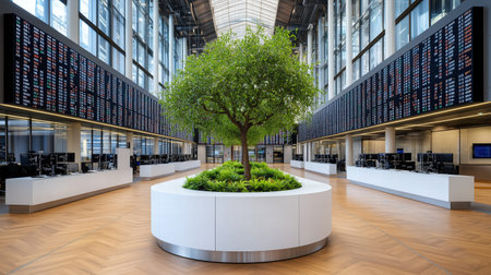 A Modern trading floor with central tree and digital displays Generative Ai